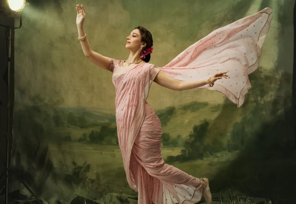 The makers released a first look of Bhatia as Jayashree, the respected actor remembered for films such as “Dr. Kotnis Ki Amar Kahani,” “Shakuntala,” “Chandra Rao More” and “Dahej.” Jayashree was also V Shantaram’s second wife and an important presence in his creative life. The poster shows Bhatia in a pink Nauvari saree with a look that brings back the tone and texture of early Indian cinema. It hints at the scale of the film and the attention given to the era it hopes to recreate.