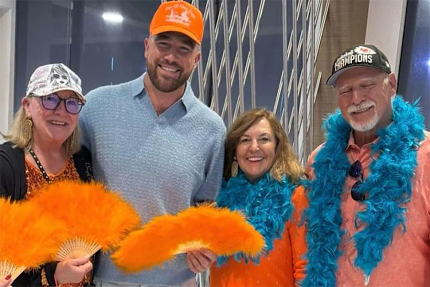 In the photo, Donna wore an orange sequined top and a white baseball cap decorated with an illustration of Swift in "1989" sunglasses surrounded by artwork inspired by the album. Travis opted for a blue collared shirt and an orange cap, smiling while holding an orange feathered fan next to his mom. His aunt and uncle coordinated in orange shirts with blue feather boas, while Don topped off his outfit with a Kansas City Chiefs Super Bowl champions hat.
