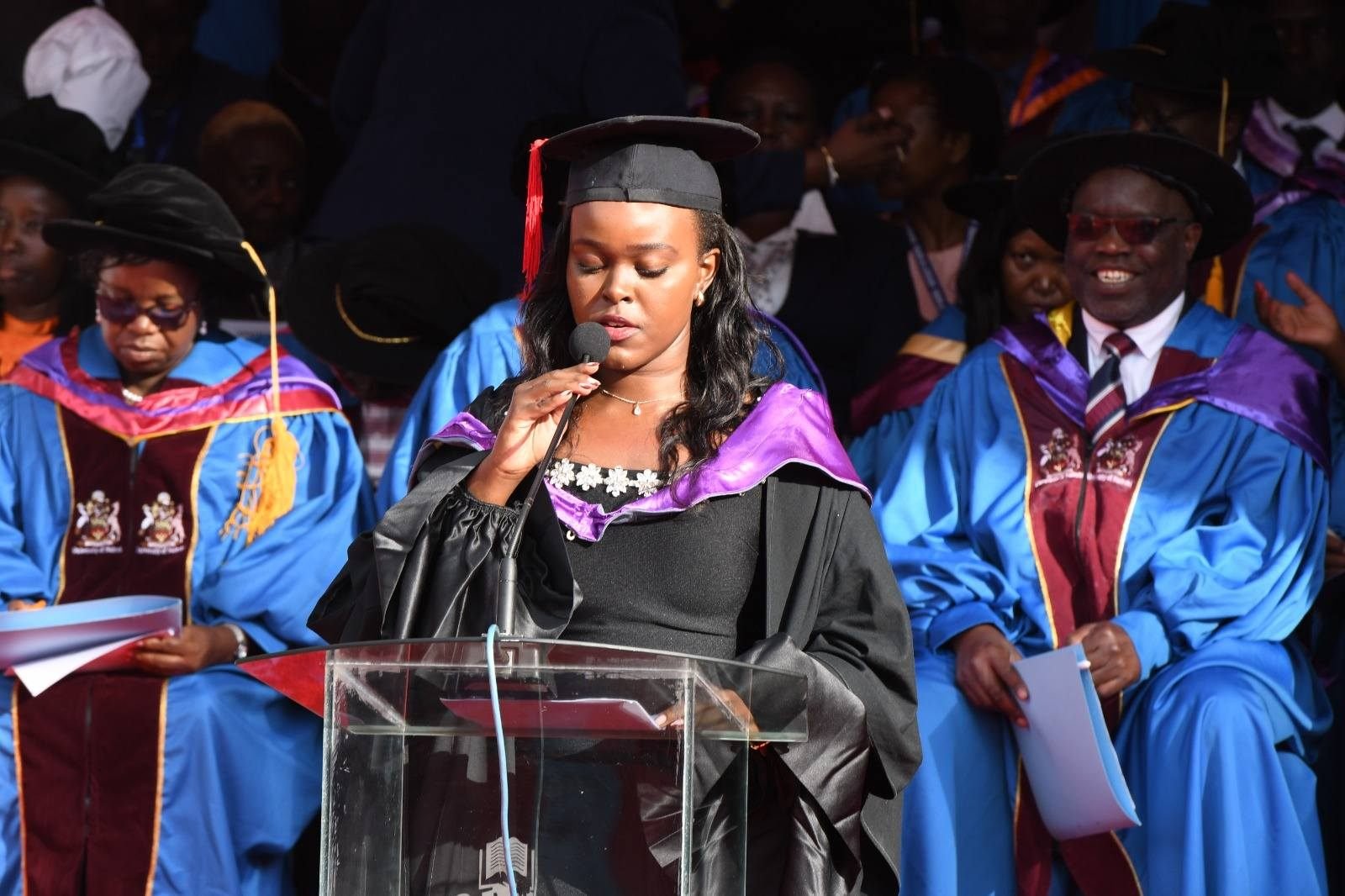 Valedictorian Joy Mwaniki inspired her peers to embrace resilience and ethical leadership: “Carry forward the University of Nairobi spirit — of service, creativity, and courage into every space you step into.”